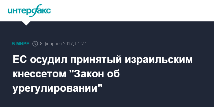 ЕС призвал израильское руководство воздерживаться от применения этого закона и избегать мер по дальнейшему повышению напряженности и созданию угрозы для перспективы мирного урегулирования конфликта. От Израиля ждут подтверждения действиями и политикой приверженности решению конфликта путем создания двух государств, чтобы восстановить взаимное доверие и создать условия для прямых и конструктивных переговоров, говорится в заявлении Могерини.