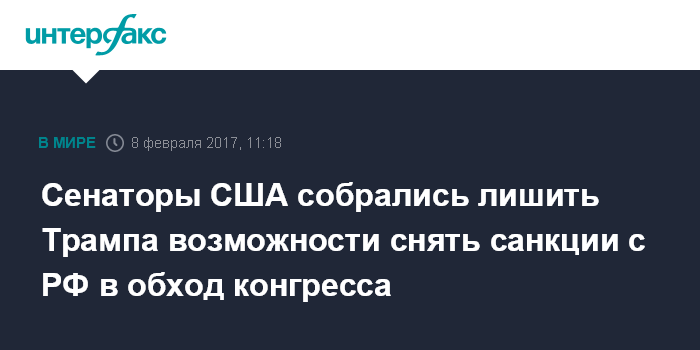 Москва. 8 февраля. INTERFAX.RU - Ряд американских сенаторов планирует в среду внести на рассмотрение коллег законопроект, согласно которому для отмены санкций против РФ президенту США Дональду Трампу нужно будет получить разрешение конгресса, сообщает CNN.