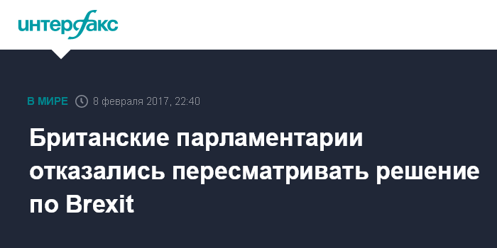 Москва. 8 февраля. INTERFAX.RU - Палата общин британского парламента в среду отказалась поддержать идею проведения еще одного референдума по выходу Великобритании из ЕС, сообщает интернет-портал британского издания Daily Telegraph.