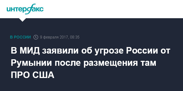 Москва. 9 февраля. INTERFAX.RU - Москва считает Румынию после появления на ее территории элементов противоракетной обороны США страной-форпостом, несущей угрозу безопасности России.