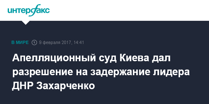 Москва. 9 февраля. INTERFAX.RU - Апелляционный суд г. Киева удовлетворил апелляционную жалобу прокурора на определение суда первой инстанции и разрешил задержание главы самопровозглашенной Донецкой народной республики Александра Захарченко для участия в рассмотрении ходатайства о его аресте.