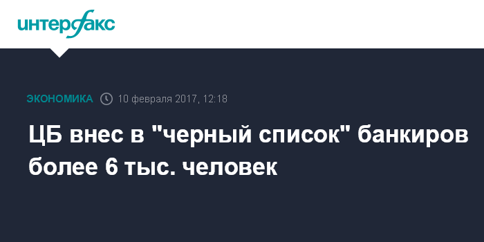 Москва. 10 февраля. INTERFAX.RU - В "черном списке" ЦБ РФ по состоянию на начало 2017 года находится свыше 6 тыс. банкиров, сообщили "Интерфаксу" в пресс-службе регулятора.