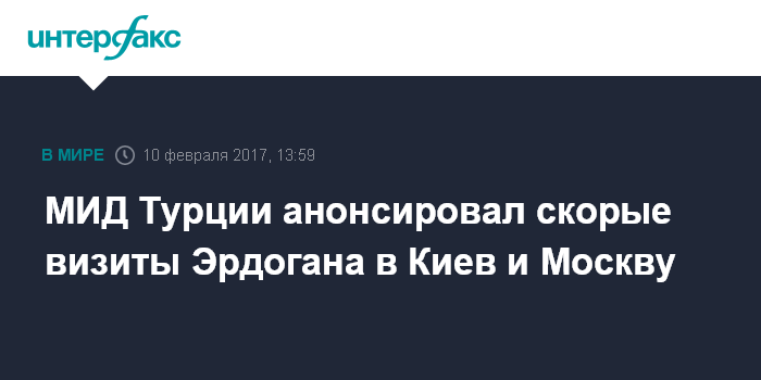 Москва. 10 февраля. INTERFAX.RU - Президент Турции Реджеп Тайип Эрдоган посетит с визитом Украину и Россию в ближайшее время, сообщил министр иностранных дел Турции Мевлют Чавушоглу.