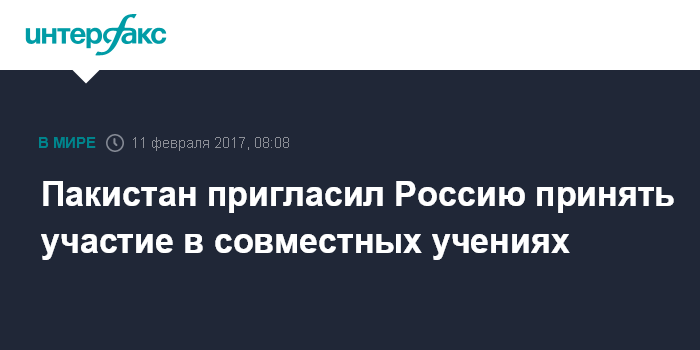 "Российские корабли участвуют в учениях Аман-2017. Мы пригласили Россию также принять участие в двусторонних учениях. Но это зависит от России и Пакистана. Если две страны хотят провести учения, то они их проводят",- сказал он "Интерфаксу", отвечая на вопрос о том, планируется ли проведение двусторонних учений в текущем году.