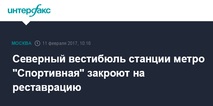 Москва. 11 февраля. INTERFAX.RU - С начала работы московского метро в понедельник, 13 февраля, на реставрацию закрывается северный вестибюль станции "Спортивная" Сокольнической линии, сообщили "Интерфаксу" в пресс-службе подземки в субботу.