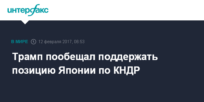 Москва. 12 февраля. INTERFAX.RU - Президент США Дональд Трамп пообещал поддержать позицию Японии на сто процентов после того, как японский премьер Синдзо Абэ осудил запуск КНДР баллистической ракеты, сообщило агентство Associated Press.