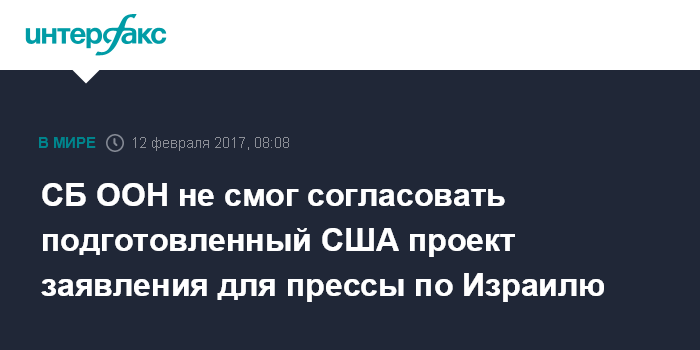 Москва. 12 февраля. INTERFAX.RU - Внесенный США проект заявления Совета Безопасности для прессы с осуждением ракетного обстрела израильского города Эйлат и теракта в Петах-Тикве не получил поддержки СБ, сообщил "Интерфаксу" источник в штаб-квартире ООН.