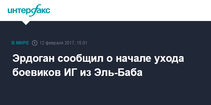 Москва. 12 февраля. INTERFAX.RU - Турецкие войска, которые оказывают поддержку отрядам сирийской оппозиции, вошли в центральную часть сирийского города Эль-Баб, его захват - это лишь дело времени, сообщил в воскресенье президент Турции Реджеп Эрдоган.