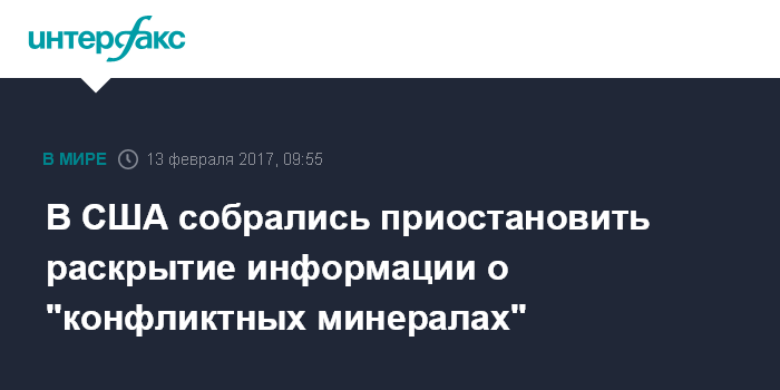 Москва. 13 февраля. INTERFAX.RU - Администрация президента США Дональда Трампа изучает возможность подписания специального указа о приостановке на 2 года действия нормативного акта Комиссии по ценным бумагам и биржам (SEC), требующего от компаний раскрытия информации об использовании ими "конфликтных минералов", пишет The Wall Street Journal.