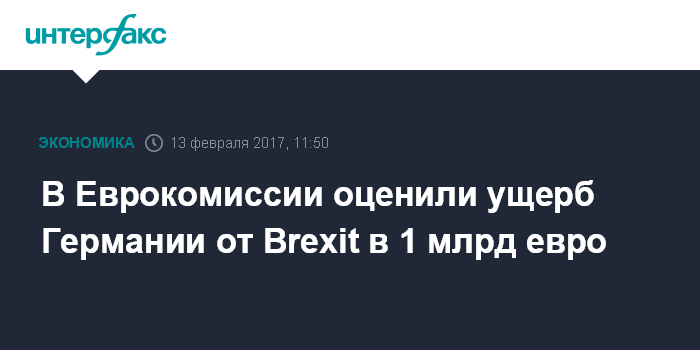 Москва. 13 февраля. INTERFAX.RU - Выход Великобритании из Европейского союза может обойтись Германии примерно в 1 млрд евро, заявил еврокомиссар по цифровой экономике и обществу Гюнтер Эттингер в интервью Bild am Sonntag. Он допускает, что из-за Brexit Германии придется увеличить выплаты в бюджет ЕС именно на эту сумму.