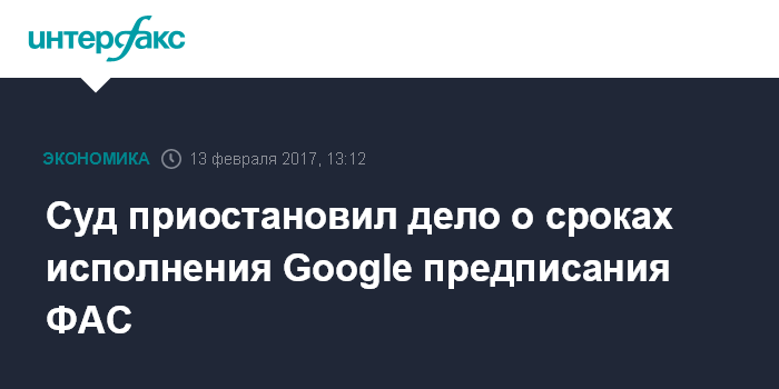 Москва. 13 февраля. INTERFAX.RU - Арбитражный суд Москвы приостановил рассмотрение иска Google к ФАС о сроках исполнения предписания до решения административных споров, сообщил "Интерфаксу" представитель ФАС. "Дело приостановлено до решения споров по административному правонарушению по ст 19.5. КоАП", - отметили в ФАС. Статья предусматривает штраф за неисполнение предписания в установленный срок до 500 тыс. рублей.