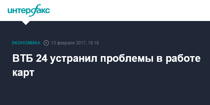 Москва. 13 февраля. INTERFAX.RU - ВТБ 24, клиенты которого в понедельник испытывали трудности с обслуживанием карт, устранил проблемы в работе систем, сообщили "Интерфаксу" в пресс-службе ВТБ.