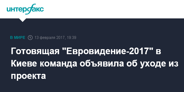 Москва. 13 февраля. INTERFAX.RU - Часть команды "Национальной общественной телерадиокомпании Украины" (ПАТ НСТУ), которая отвечала за подготовку и проведение песенного конкурса "Евровидение 2017", заявила, что больше не может продолжать свою работу.