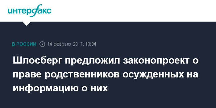 Москва. 14 февраля. INTERFAX.RU - Депутат Псковского областного собрания Лев Шлосберг (фракция партии "Яблоко") внес в региональный парламент проект закона о защите прав родственников осужденных к лишению свободы на получение информации об их местонахождении во время отбывания наказания.