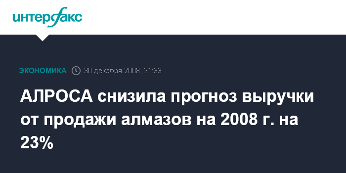 Москва. 30 декабря. INTERFAX.RU - Наблюдательный совет АК "АЛРОСА" на заседании во вторник снизил прогноз выручки от продажи алмазов на 2008 г. с $3 млрд 41,2 млн до $2 млрд 330,7 млн, говорится в сообщении компании.