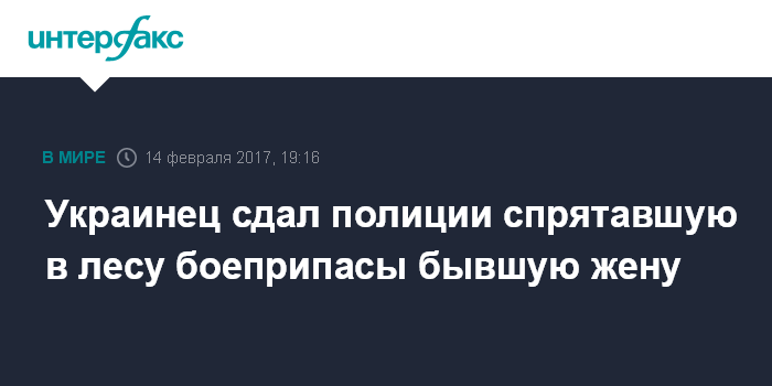 Москва. 14 февраля. INTERFAX.RU - Украинская полиция после сигнала от 42-летнего жителя Сумской области обнаружила в местном лесу устроенный его бывшей женой тайник с найденными ею ранее боеприпасами и взрывчаткой.