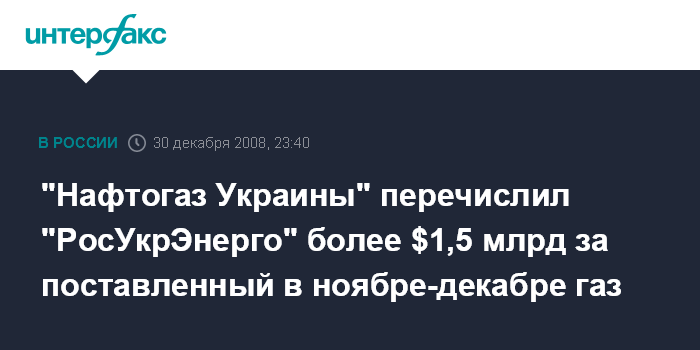 Киев. 30 декабря. ИНТЕРФАКС-УКРАИНА - НАК "Нафтогаз Украины" перечислила "РосУкрЭнерго" более $1,5 млрд за поставленный в период за ноябрь-декабрь 2008 года природный газ, сообщили агентству "Интерфакс-Украина" в пресс-центре НАК.