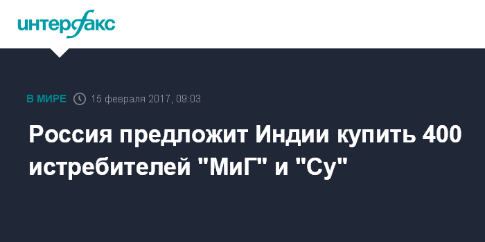 Москва. 15 февраля. INTERFAX.RU - Россия будет участвовать в индийском тендере на поставку 400 истребителей для Военно-воздушных сил страны, сообщил заместитель директора ФСВТС России Владимир Дрожжов.