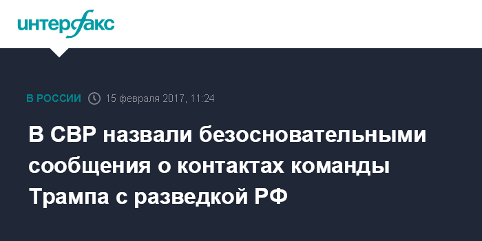 Москва. 15 февраля. INTERFAX.RU - В пресс-бюро Службы внешней разведки (СВР) РФ назвали бездоказательными утверждения газеты The New York Times о якобы имевших место в ходе избирательной кампании контактах членов команды нынешнего президента США Дональда Трампа с представителями российской разведки.