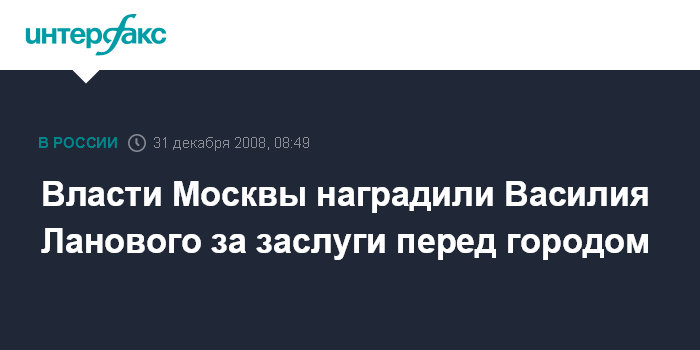 "За заслуги в развитии театрального искусства и кино, а также большой вклад в патриотическое воспитание подрастающего поколения принято решение о награждении Василия Семеновича Ланового, артиста Государственного академического театра им.Е.Вахтангова знаком отличия "За заслуги перед Москвой", - сказал собеседник агентства.