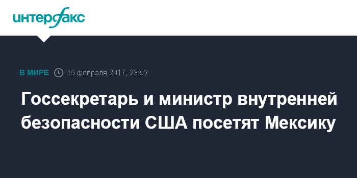 Москва. 15 февраля. INTERFAX.RU - Госсекретарь США Рекс Тиллерсон и министр внутренней безопасности Джон Келли 23 февраля. Посетят Мехико, сообщает в среду агентство ЭФЭ со ссылкой на заявление мексиканского МИД.
