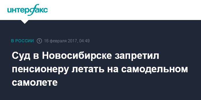 Москва. 16 февраля. INTERFAX.RU - Суд в Новосибирске запретил пенсионеру летать на самодельном самолете, сообщает в четверг Западно-Сибирская транспортная прокуратура.