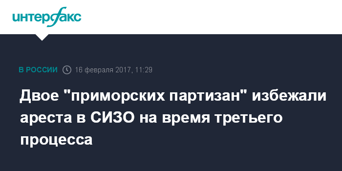 Москва. 16 февраля. INTERFAX.RU - Приморский краевой суд во Владивостоке в четверг не стал заключать под стражу двух фигурантов дела банды так называемых "приморских партизан", которые оказались на свободе летом прошлого года по итогам повторного суда, оправдавшего их по эпизоду с убийством четырех человек.