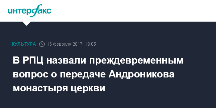 Москва. 16 февраля. INTERFAX.RU - Поднимать вопрос о передаче Церкви Андроникова монастыря в Москве пока преждевременно, заявили в Московской патриархии, не исключив этого в будущем.
