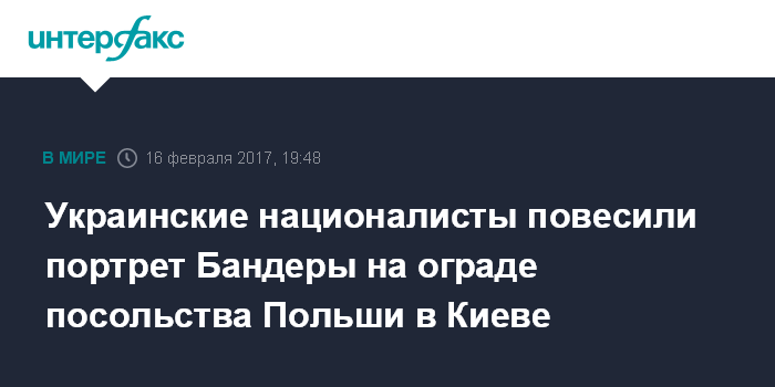 Москва. 16 февраля. INTERFAX.RU - Портрет лидера ОУН Степана Бандеры появился в четверг на ограде посольства Польши в Киеве. Его вывесили активисты украинской националистической организации "Черный комитет".