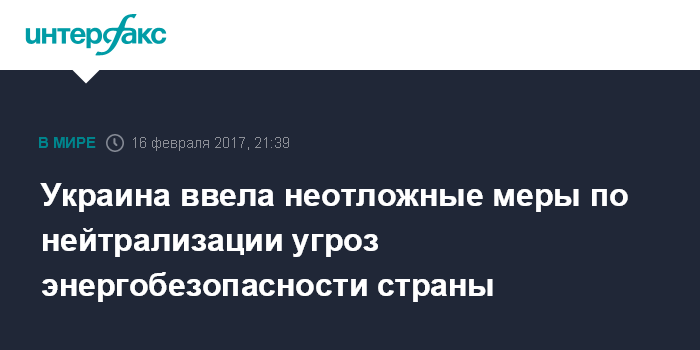 Москва. 16 февраля. INTERFAX.RU - Президент Украины Петр Порошенко своим указом ввел в действие решение Совета национальной безопасности и обороны (СНБО) от 16 февраля 2017 г. "О неотложных мерах по нейтрализации угроз энергетической безопасности Украины и усиления защиты критической инфраструктуры".