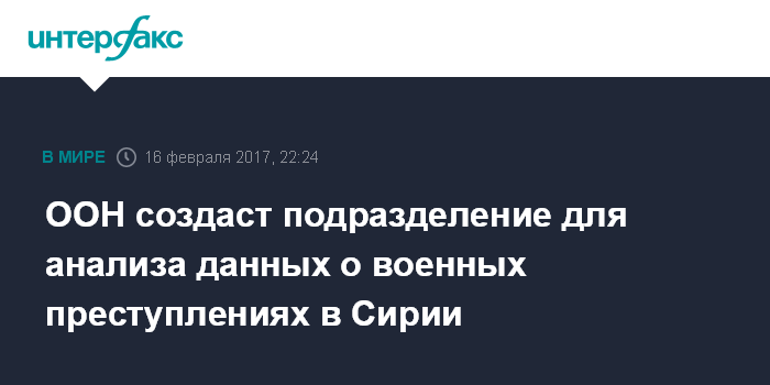 Москва. 16 февраля. INTERFAX.RU - ООН планирует создать подразделение при Всемирной организации в Женеве, которое будет расследовать данные о военных преступлениях в Сирии, пишет в четверг британская газета The Guardian.