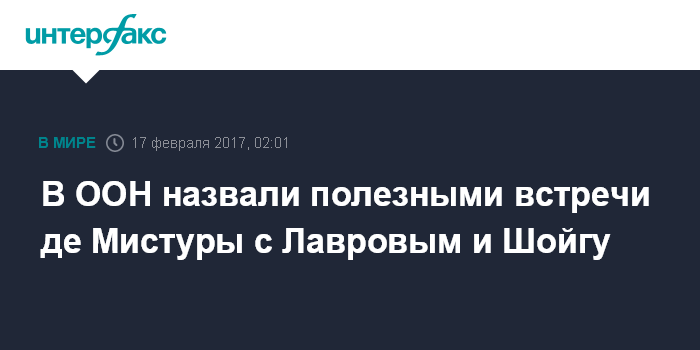 Москва. 17 февраля. INTERFAX.RU - Встречи спецпосланника генерального секретаря ООН по Сирии Стаффана де Мистуры с главой МИД РФ Сергеем Лавровым, министром обороны РФ Сергеем Шойгу, а также заместителем министра иностранных дел РФ Геннадием Гатиловым были "полезными и продуктивными", сообщили в ООН