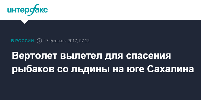 Москва. 17 февраля. INTERFAX.RU - Вертолет Ми-8 Сахалинского звена Хабаровского авиационного центра МЧС вылетел из Южно-Сахалинска в район, где ведется спасательная операция по снятию с оторвавшейся от припая льдины восьми рыбаков-любителей у юго-востока Сахалина.