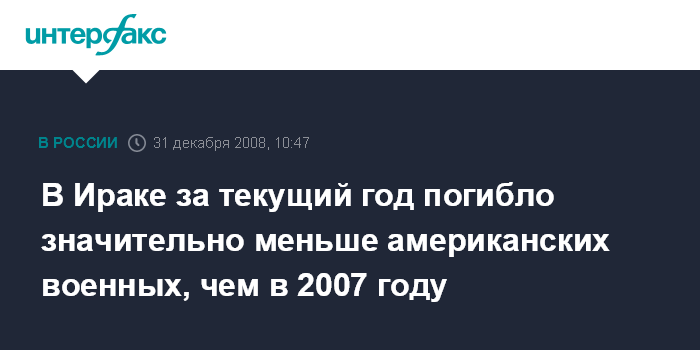 Согласно подсчетам, проведенным телекомпанией, в 2008 году в Ираке погибли 309 американских военных. Из них 222 человека были убиты во время боевых действий и еще 87 расстались с жизнью при иных обстоятельствах, таких как автокатастрофы, самоубийства.