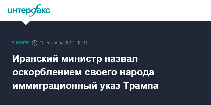 Москва. 18 февраля. INTERFAX.RU - Иммиграционный указ президента США, согласно которому на 90 дней приостанавливается въезд в США из стран с преимущественно мусульманским населением, нанес оскорбление всему иранскому народу, заявил глава МИД Ирана Мохаммад Джавад Зариф.