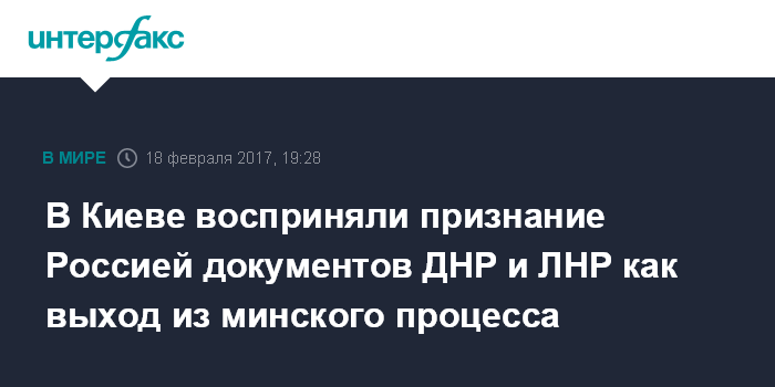 Москва. 18 февраля. INTERFAX.RU - Подписав указ о признании паспортов и других документов самопровозглашенных Донецкой и Луганской народных республик (ЛНР и ДНР), президент России юридически признал квазигосударственные группировки и вышел из минского процесса, считает секретарь Совета национальной безопасности и обороны (СНБО) Украины Александр Турчинов.