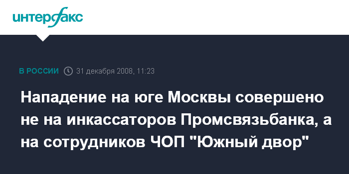 Москва. 31 декабря. INTERFAX.RU - Нападение на юге Москвы во вторник было совершено не на инкассаторов Промсвязьбанка, а на сотрудников частного охранного предприятия (ЧОП) "Южный двор".