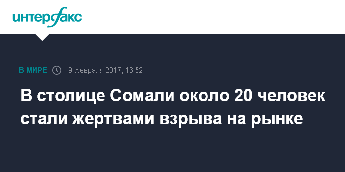 Москва. 19 февраля. INTERFAX.RU - По меньшей мере, 18 человек погибли и не менее 25 получили ранения в результате взрыва на рынке в столице Сомали городе Могадишо, сообщили СМИ.