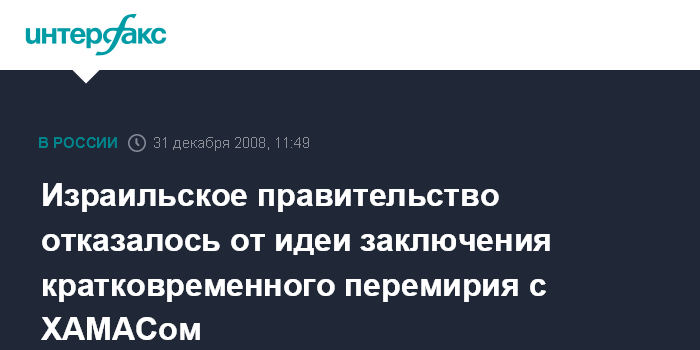 Москва. 31 декабря. INTERFAX.RU - Руководство Израиля в среду отвергло предложение, выдвинутое Францией, о заключении с палестинской группировкой ХАМАС 48-часового перемирия, сообщают израильские СМИ.
