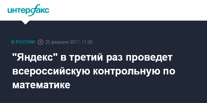 Москва. 20 февраля. INTERFAX.RU - "Яндекс" 11 марта проведет третью ежегодную всероссийскую контрольную по математике "Что и требовалось доказать", говорится в пресс-релизе компании.