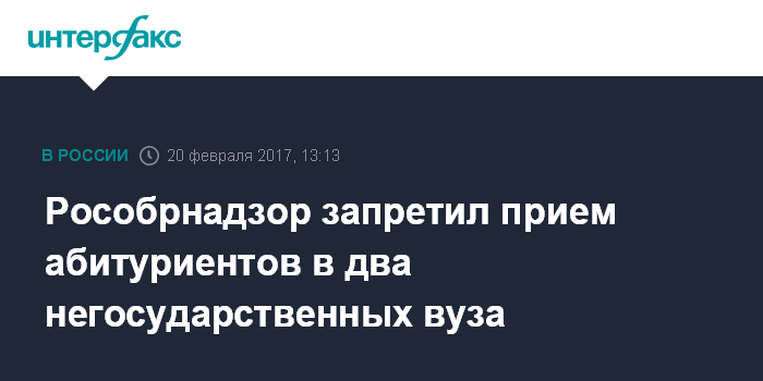 Москва. 20 февраля. INTERFAX.RU - Федеральная служба по надзору в сфере образования и науки (Рособрнадзор) с 10 по 16 февраля запретила прием в негосударственный "Гуманитарный институт" (Москва) и "Невский институт языка и культуры" (Санкт-Петербург), сообщает пресс-служба ведомства.