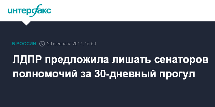 Москва. 20 февраля. INTERFAX.RU - В Госдуму внесен законопроект, предлагающий досрочно прекращать полномочия сенаторов за 30-дневное неучастие в работе Совета Федерации.