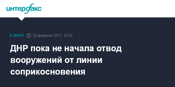 Москва. 20 февраля. INTERFAX.RU - Ополченцы самопровозглашенной Донецкой народной республики пока не произвели отвод вооружений от линии соприкосновения, сообщили "Интерфаксу" в минобороны ДНР.