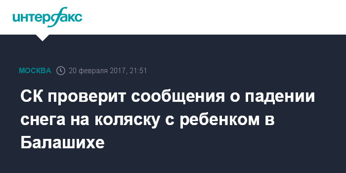 Москва. 20 февраля. INTERFAX.RU - СК проверит сообщения о падении с крыши мокрого снега на коляску с ребенком в подмосковной Балашихе, сообщили в понедельник "Интерфаксу" в пресс-службе регионального главка.
