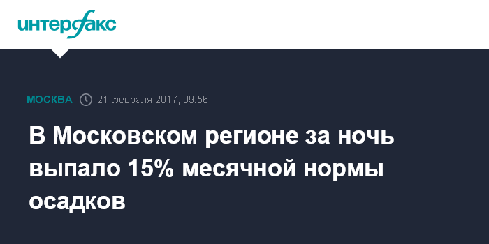 Москва. 21 февраля. INTERFAX.RU - К 9:00 вторника в столичном регионе выпало около 15% месячной нормы осадков, которая в феврале составляет 36 мм, сообщает Гидрометцентр России.