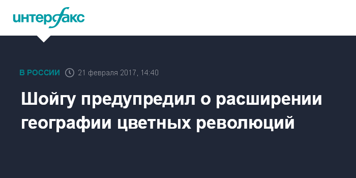Москва. 21 февраля. INTERFAX.RU - Существует вероятность того, что география цветных революций будет расширяться, считает министр обороны РФ генерал армии Сергей Шойгу.