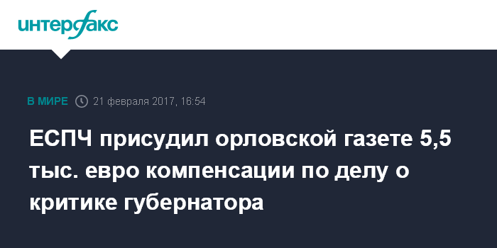 Москва. 21 февраля. INTERFAX.RU - Европейский суд по правам человека (ЕСПЧ) во вторник обязал Россию выплатить 5,5 тыс. евро редакции газеты "Орловская искра" в качестве компенсации материального и морального ущерба за нарушение ее права на выражение мнения.