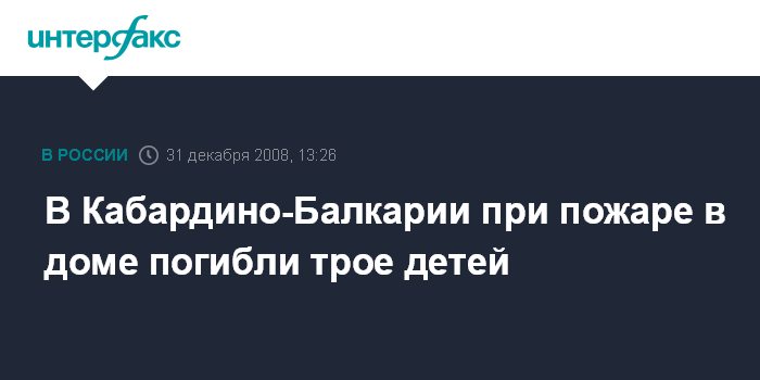Москва. 31 декабря. INTERFAX.RU - Трое малолетних детей погибли на пожаре в поселке Советский (Кабардино-Балкария) в последний день уходящего года.