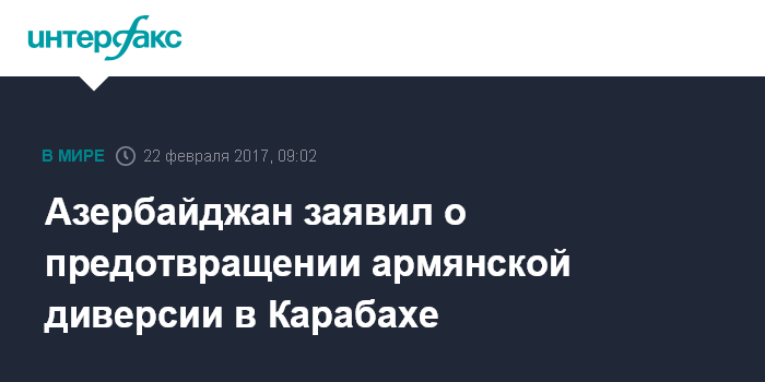 "Разведывательно-диверсионная группа ВС Армении с целью совершить очередную провокацию пыталась совершить проникновение на азербайджанские позиции в Нагорном Карабахе 21 февраля. Подразделения азербайджанских вооруженных сил, постоянно наблюдающие за передвижениями противника, выявили его действия заблаговременно и нанесли огневой удар", - отмечается в сообщении Минобороны Азербайджана.