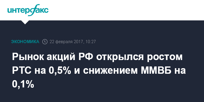 Москва. 22 февраля. INTERFAX.RU - Рынок акций РФ открылся в среду смешанной динамикой рублевых цен blue chips из-за укрепления рубля и на фоне благоприятной внешней конъюнктуры, индекс ММВБ за минуту торгов просел на 0,1%, а долларовый индекс РТС вырос на 0,5%.